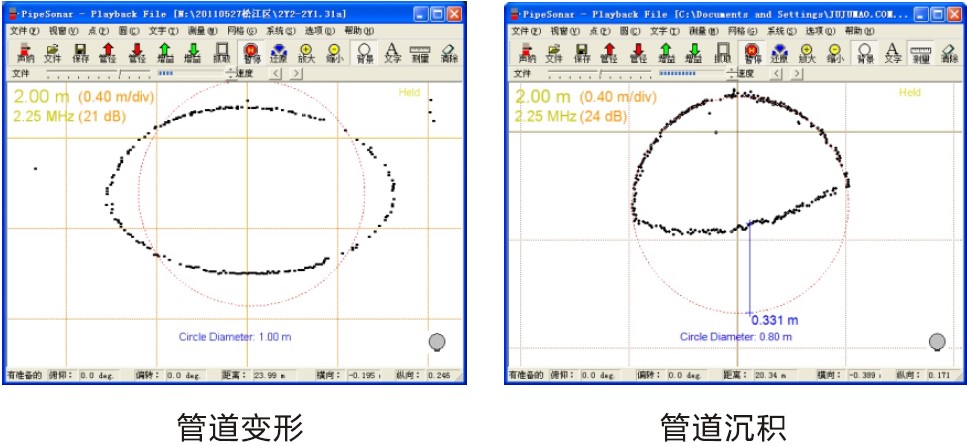 ◆ 可绘制管道内污泥沉积断面����� �������Ƴ������������ �������Ƴ������������ �������Ƴ����������� �������Ƴ�������图,为管道养护提供直观,可靠的依据;